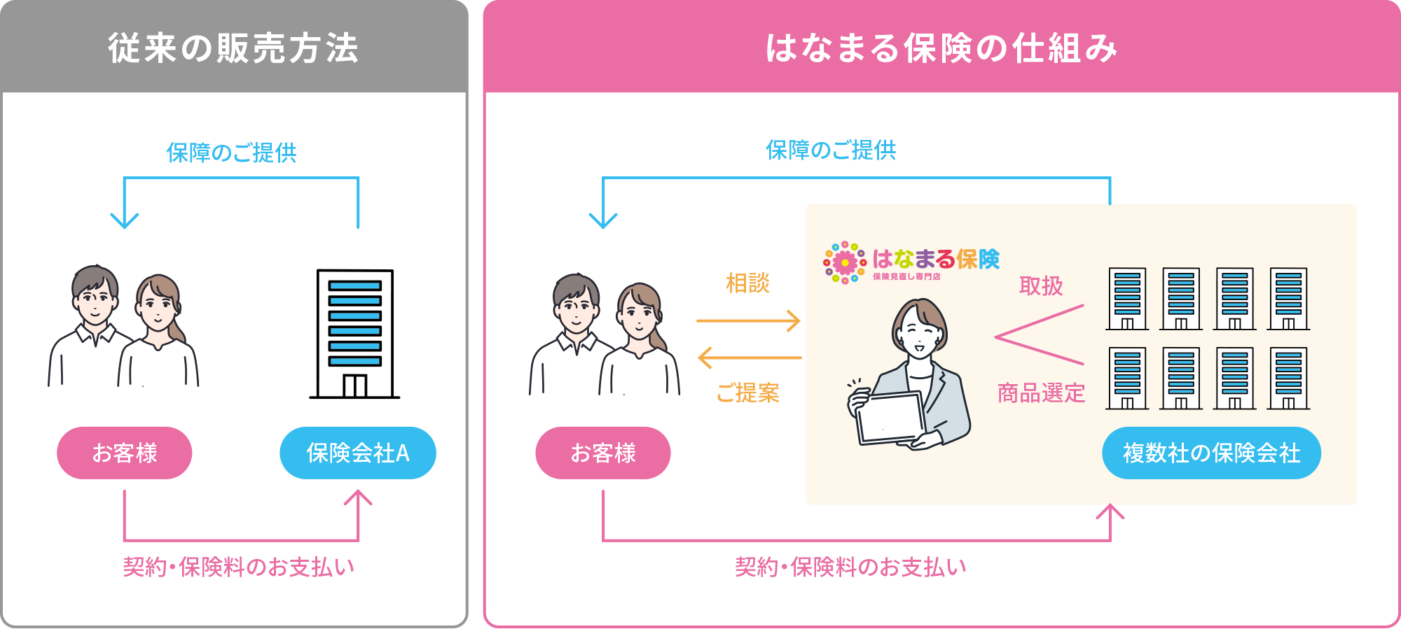 はなまる保険は、様々な年齢層の方やライフステージに合わせ、各種保険相談に力を入れている保険のプロフェッショナル集団であり、多数の保険会社の数百種類の保険商品を取り扱っております。そのため特定の保険会社に偏らず、お客様のライフステージ、ニーズに合わせた最適な保険商品を提案することができます。