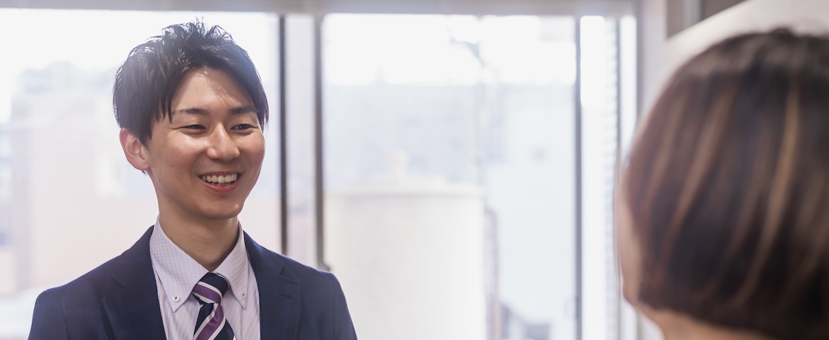 - 現在の部署は営業部に所属しエリアリーダー職という役職に就いています。現在の仕事内容は3店舗の運営をマネジメントしています。主に城東地域のお客様に保険という目には見えない、万が一に備える安心を届ける仕事と、後輩や一緒に働くメンバー育成が主な仕事です。